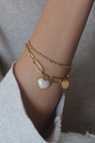 Double bracelets dorées en acier inoxydable avec pendentifs.