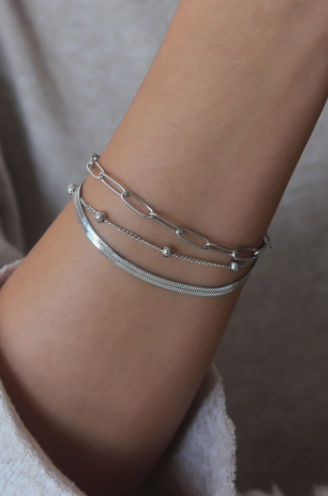 Lot de trois bracelets de couleur argentés et en acier inoxydable.