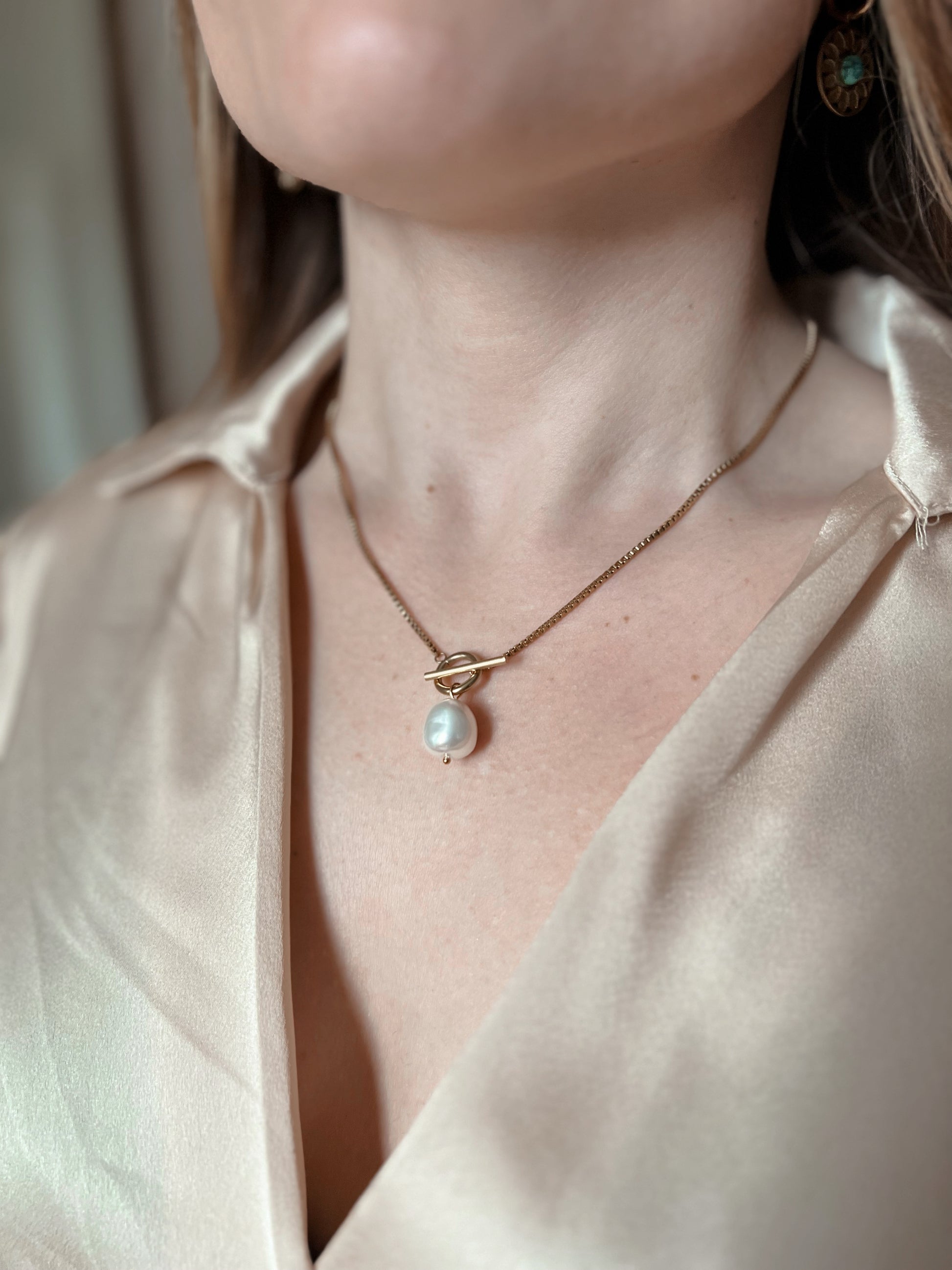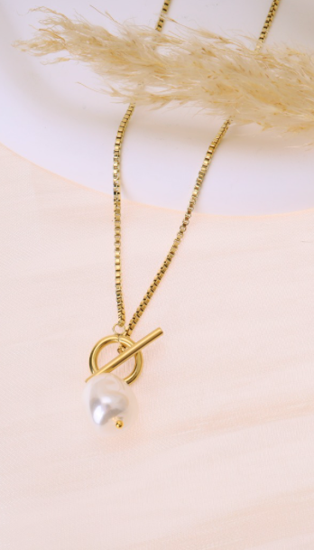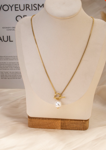 Collier en acier inoxydable de couleur doré avec un pendentif et une perle.