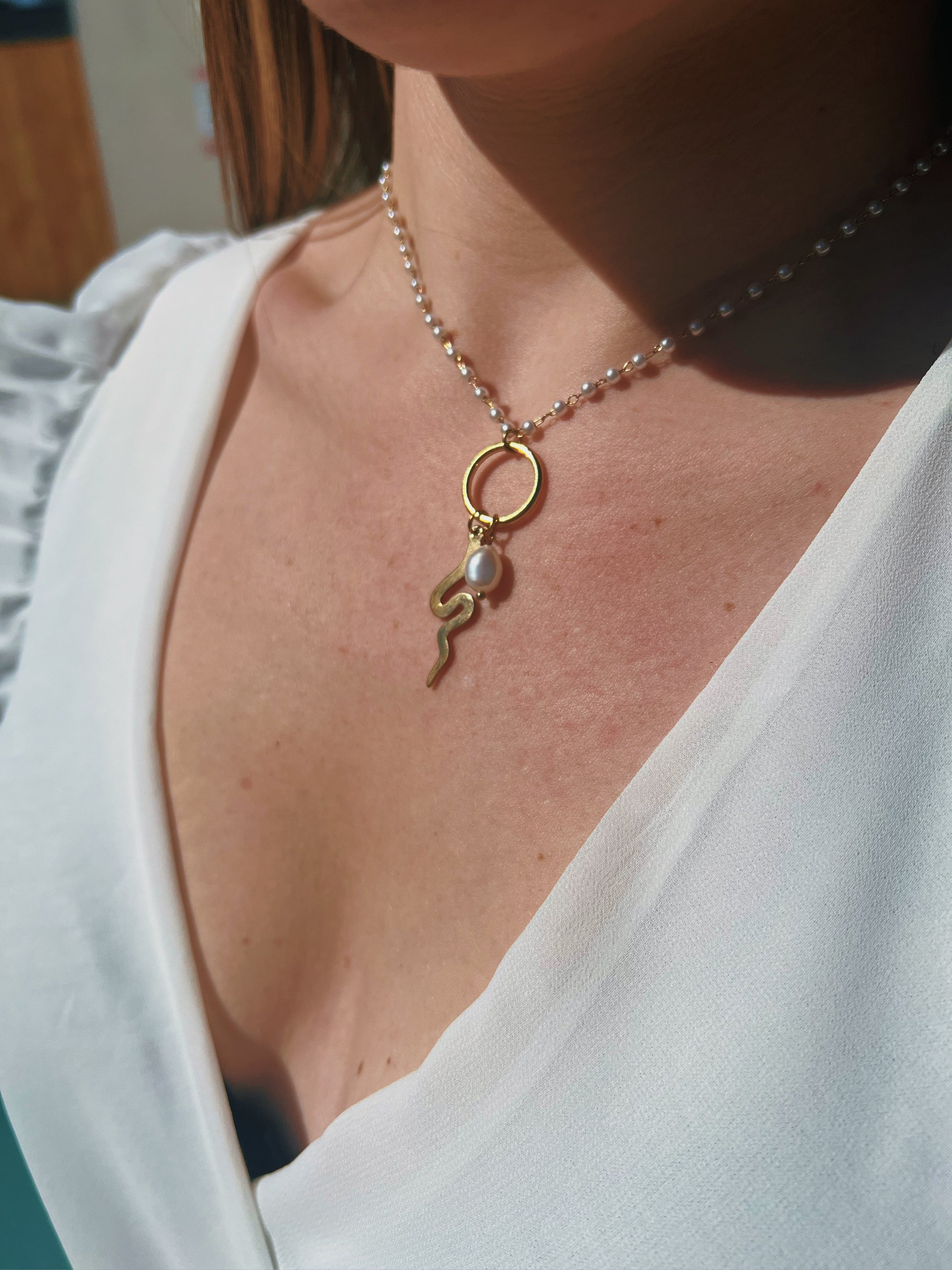 Collier Manon en acier inoxydable de couleur doré orné de perles et avec pendentifs.