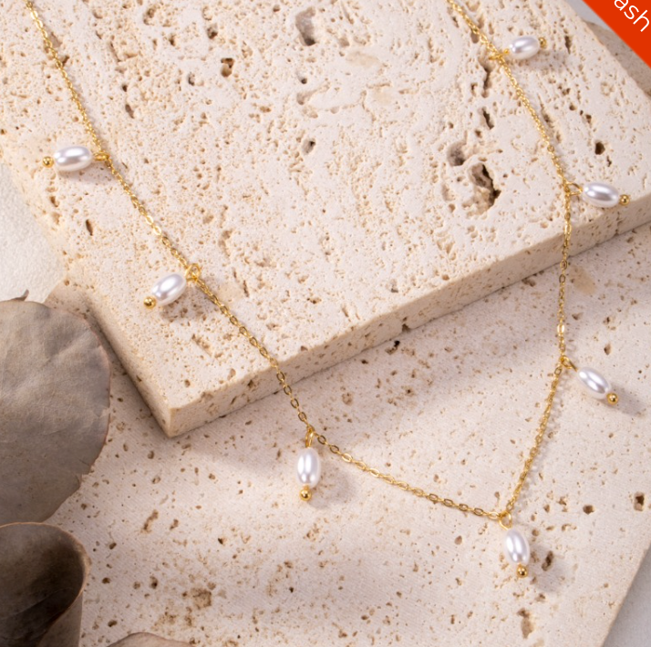 Collier en acier inoxydable de couleur doré avec des perles pendantes.