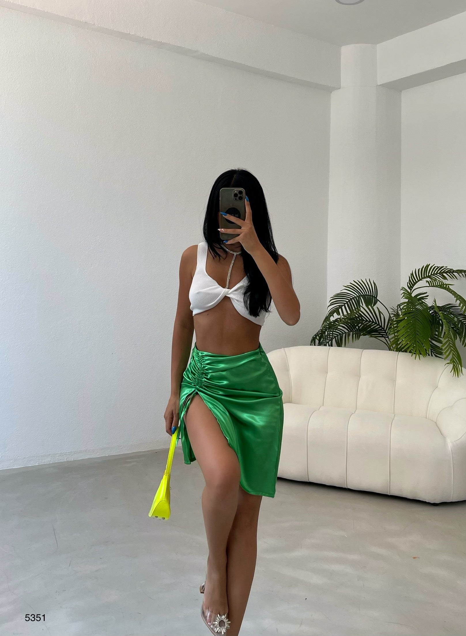 Jupe satinée Eddy avec fente sur le coté et lacets. Couleur verte.