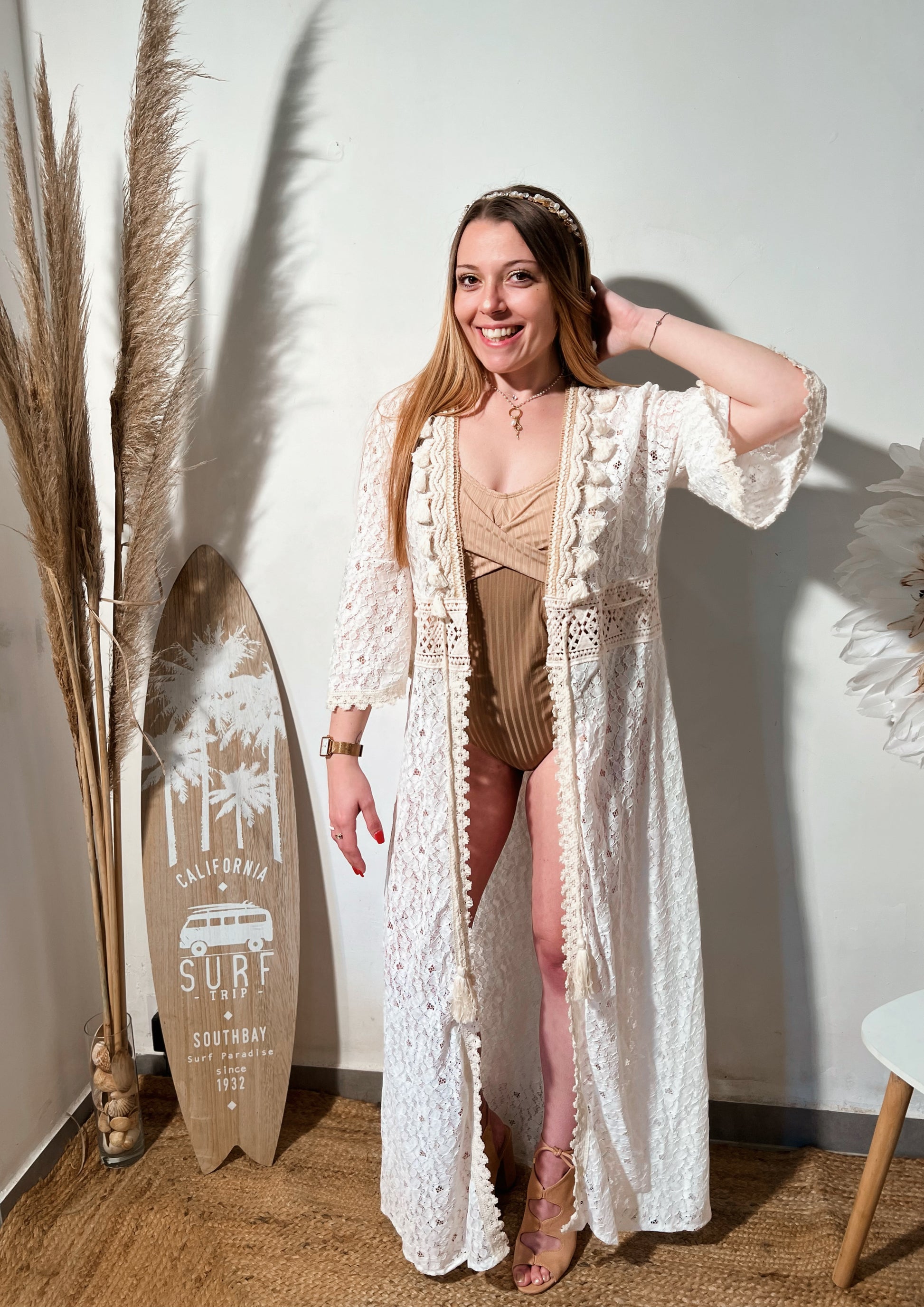 Kimono long blanc en dentelle avec des détails beige. Taille unique.