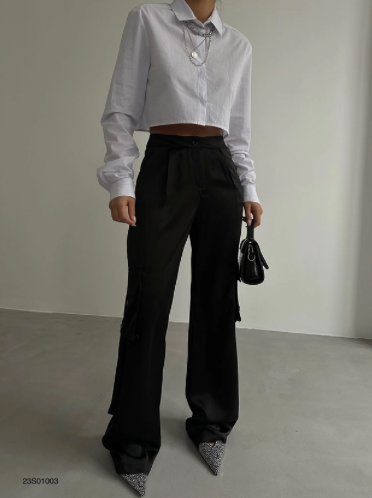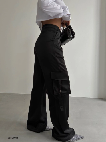 Pantalon évasé et Cargo Diane de couleur noire et effet satiné.