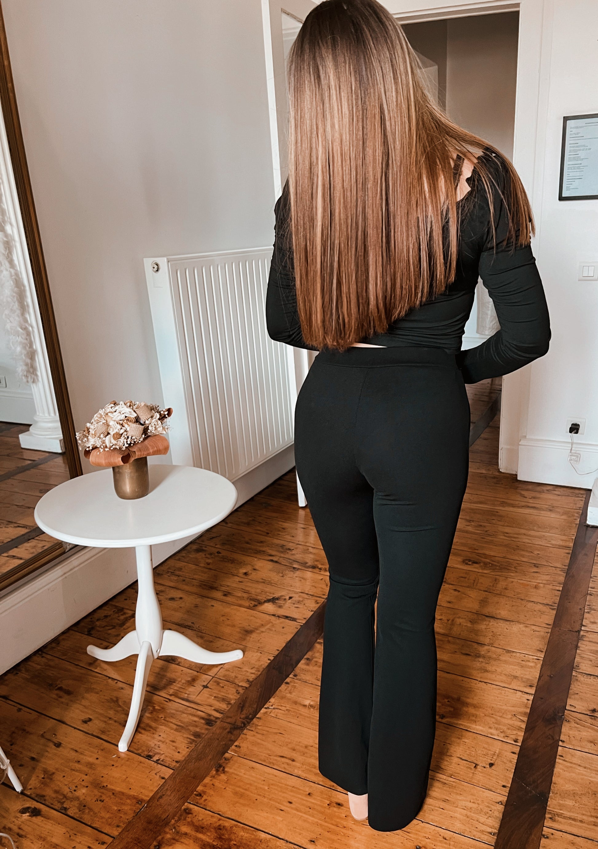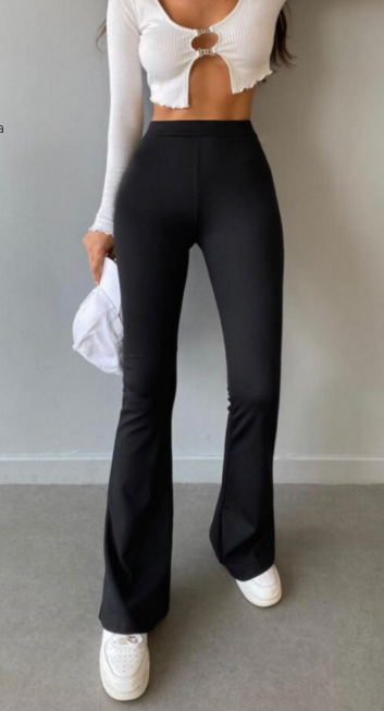 Pantalon noir moulant puis évasé en bas.