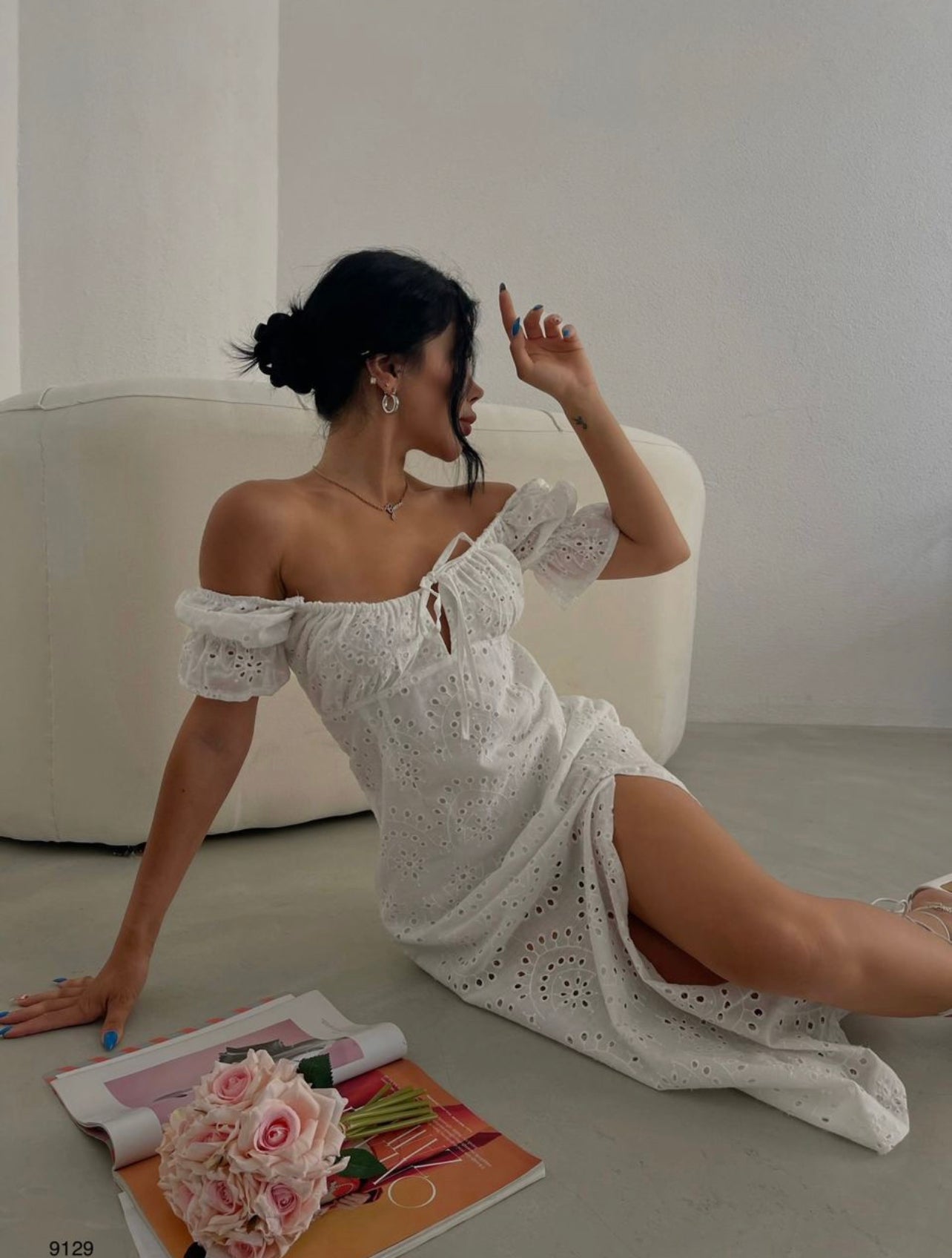 Robe blanche Belma à épaules dénudées et fentes sur le coté de la robe.