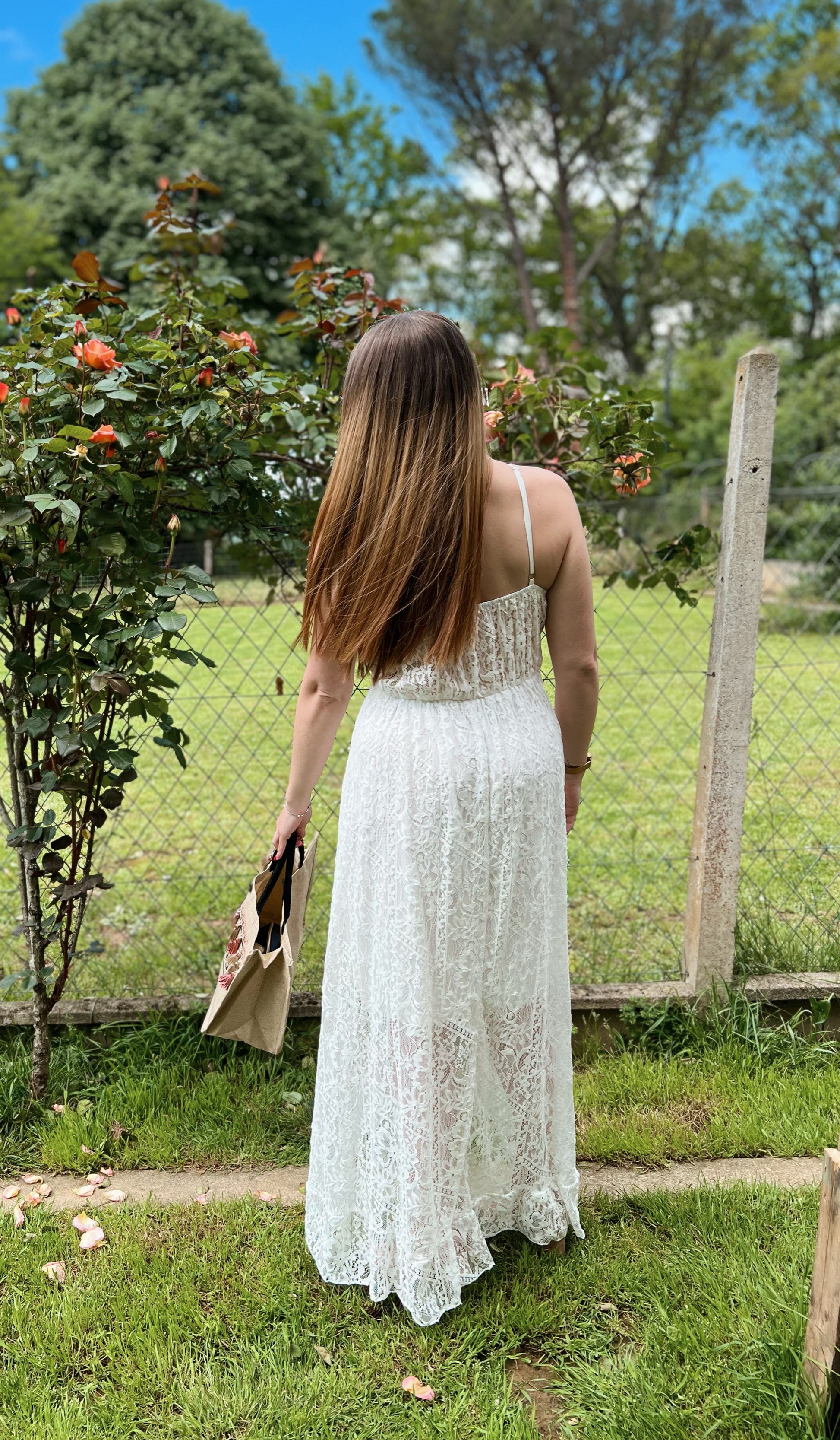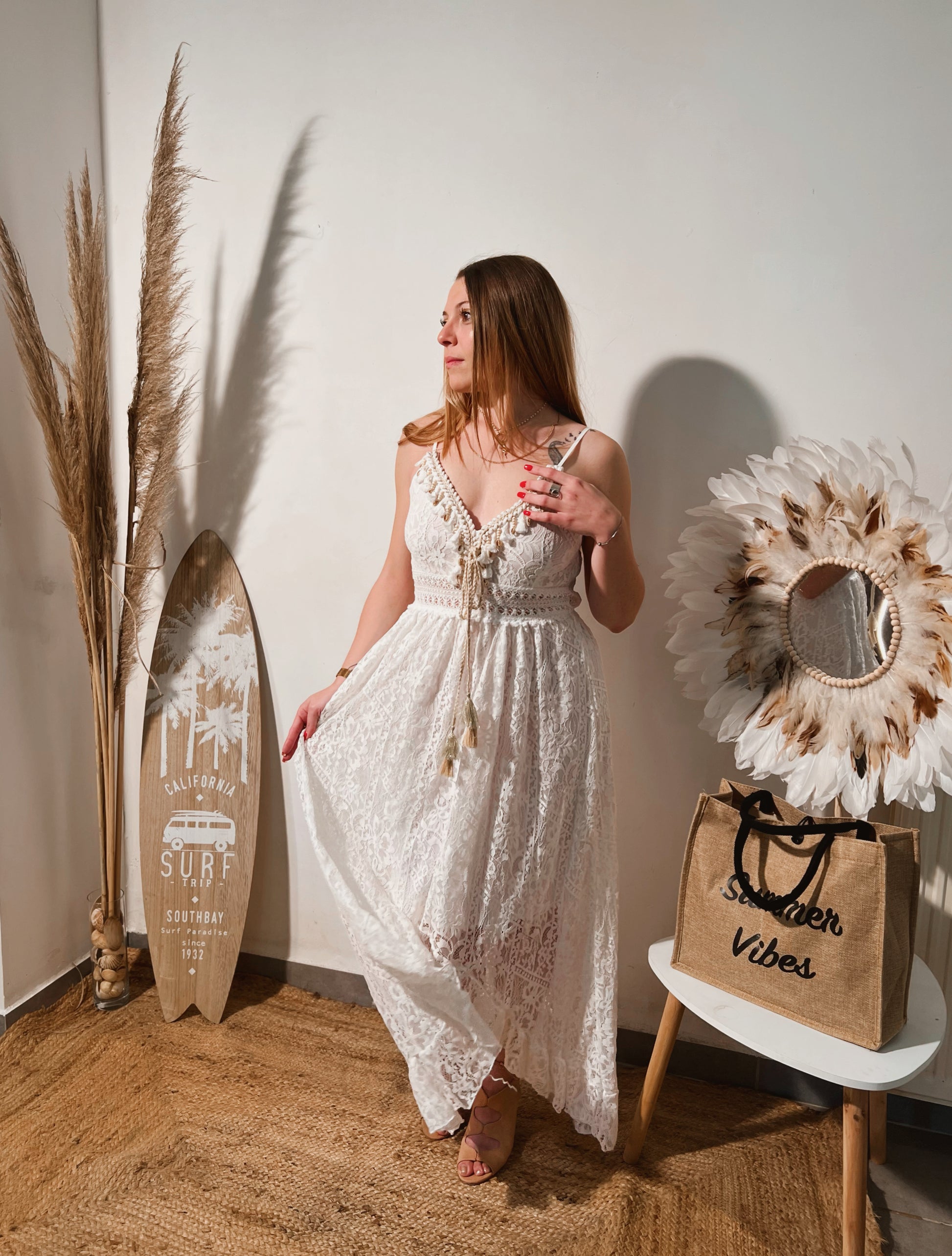 Robe longue blanche en dentelle.