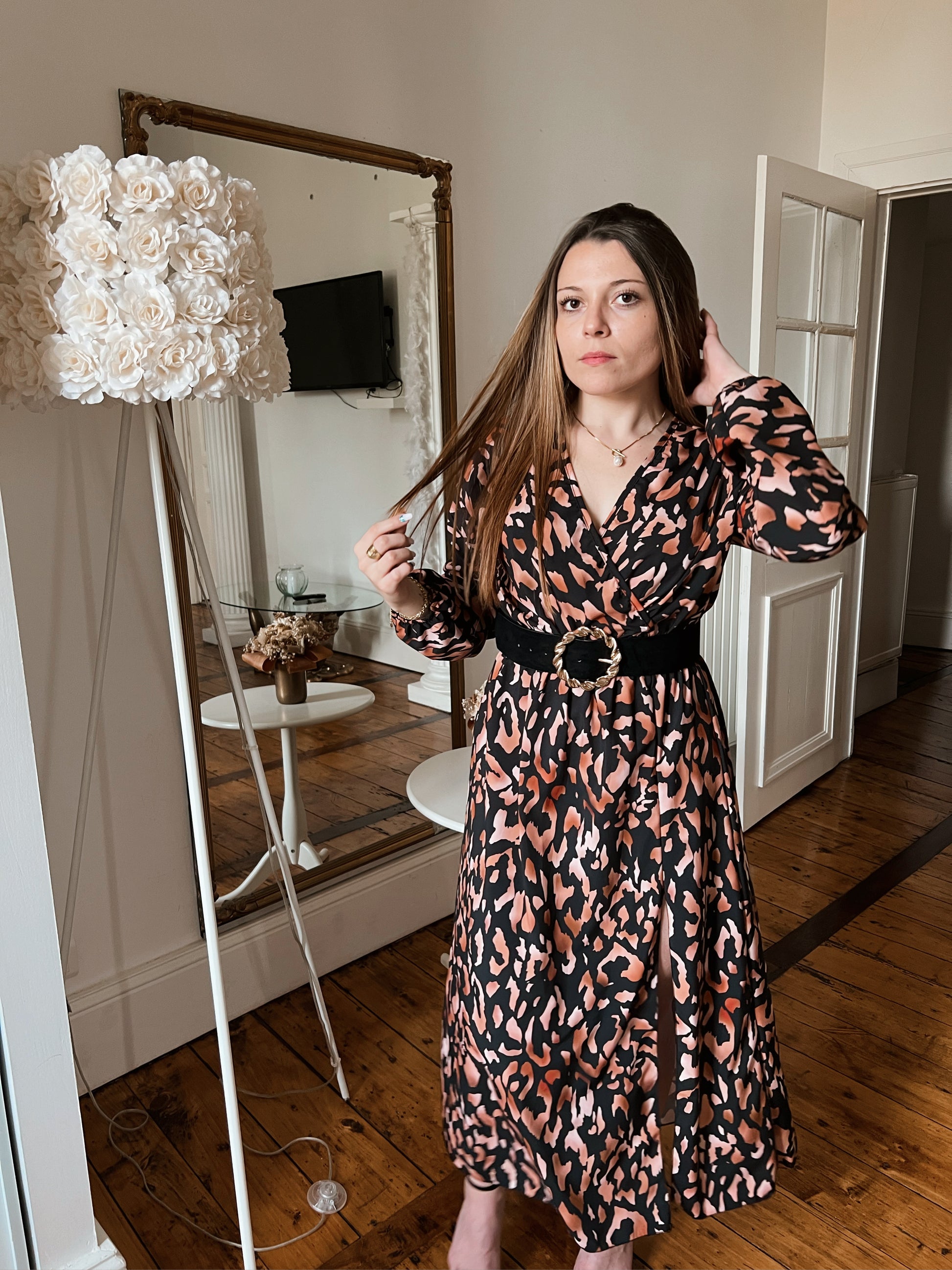 Robe longue imprimée Léopard Lily. Manches longues, robe avec fente sur le coté.