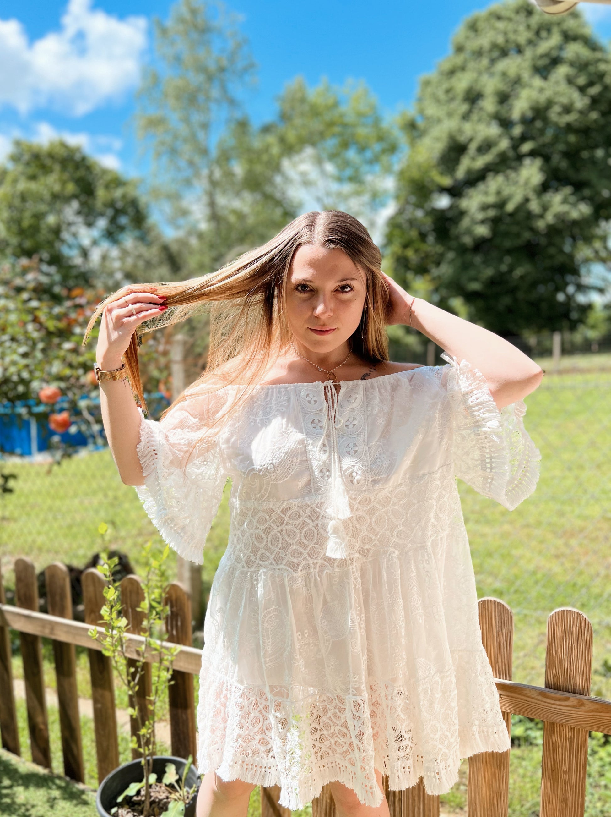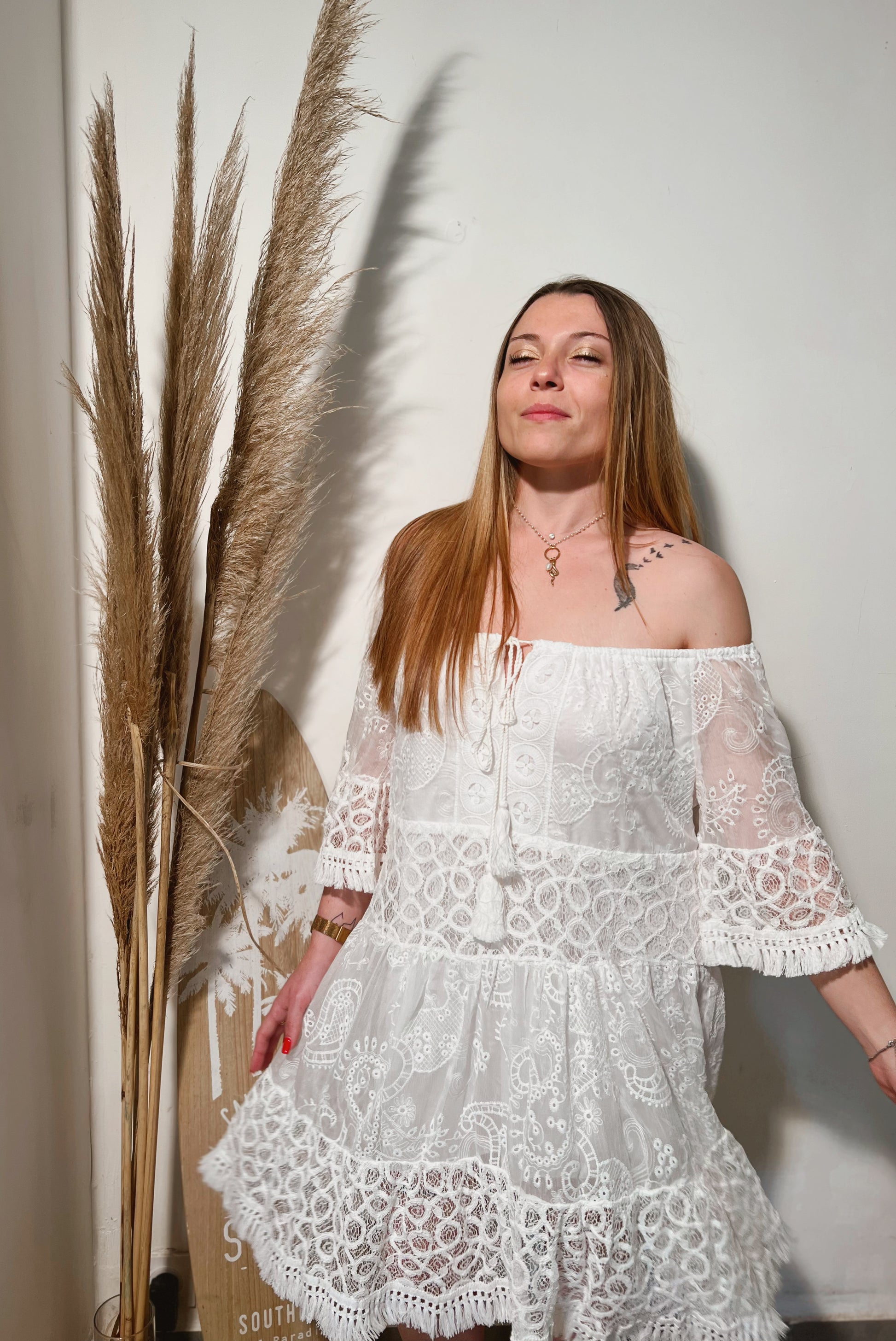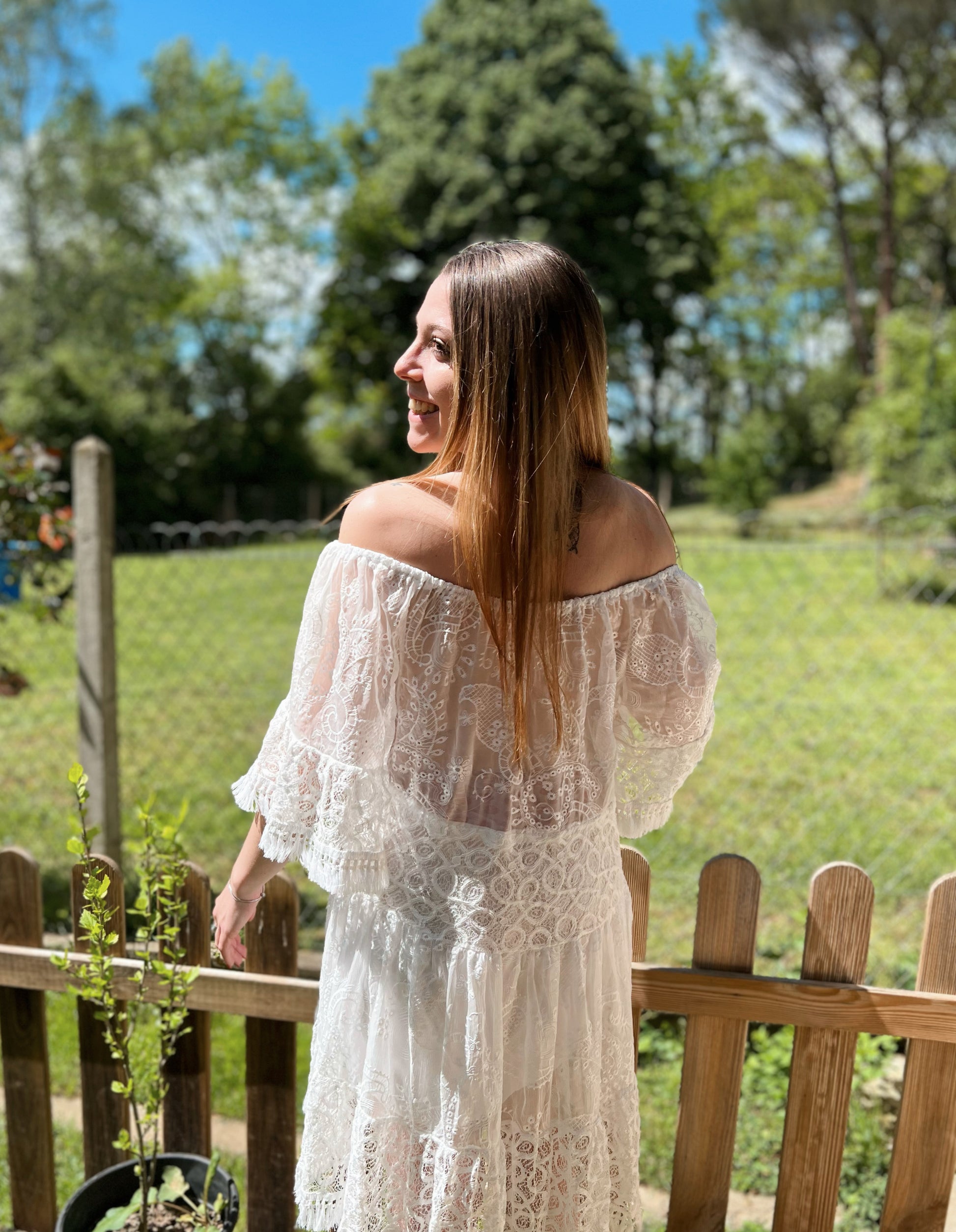 Robe en dentelle blanche Paola, idéalement faite pour être portée les épaules nues.