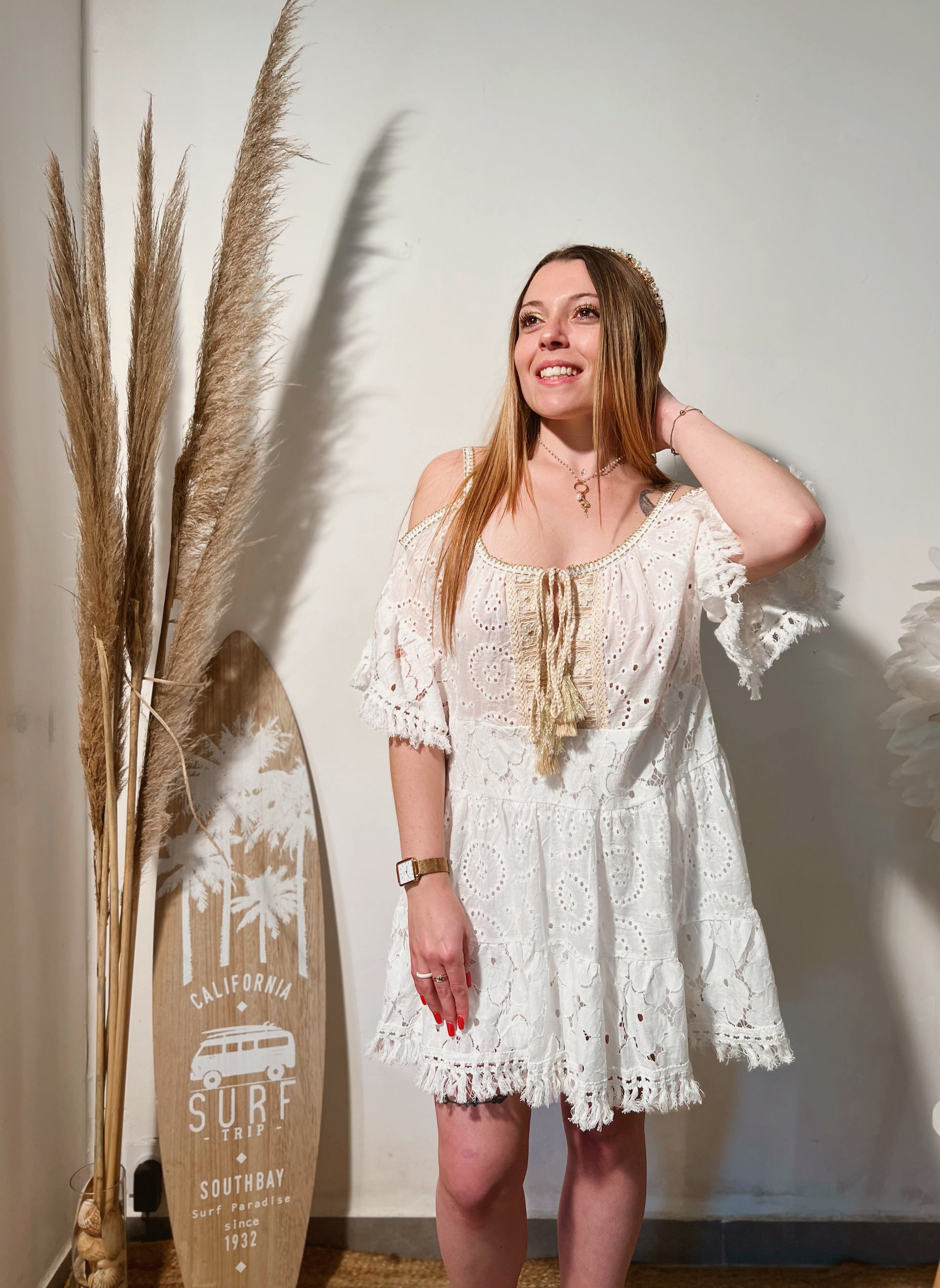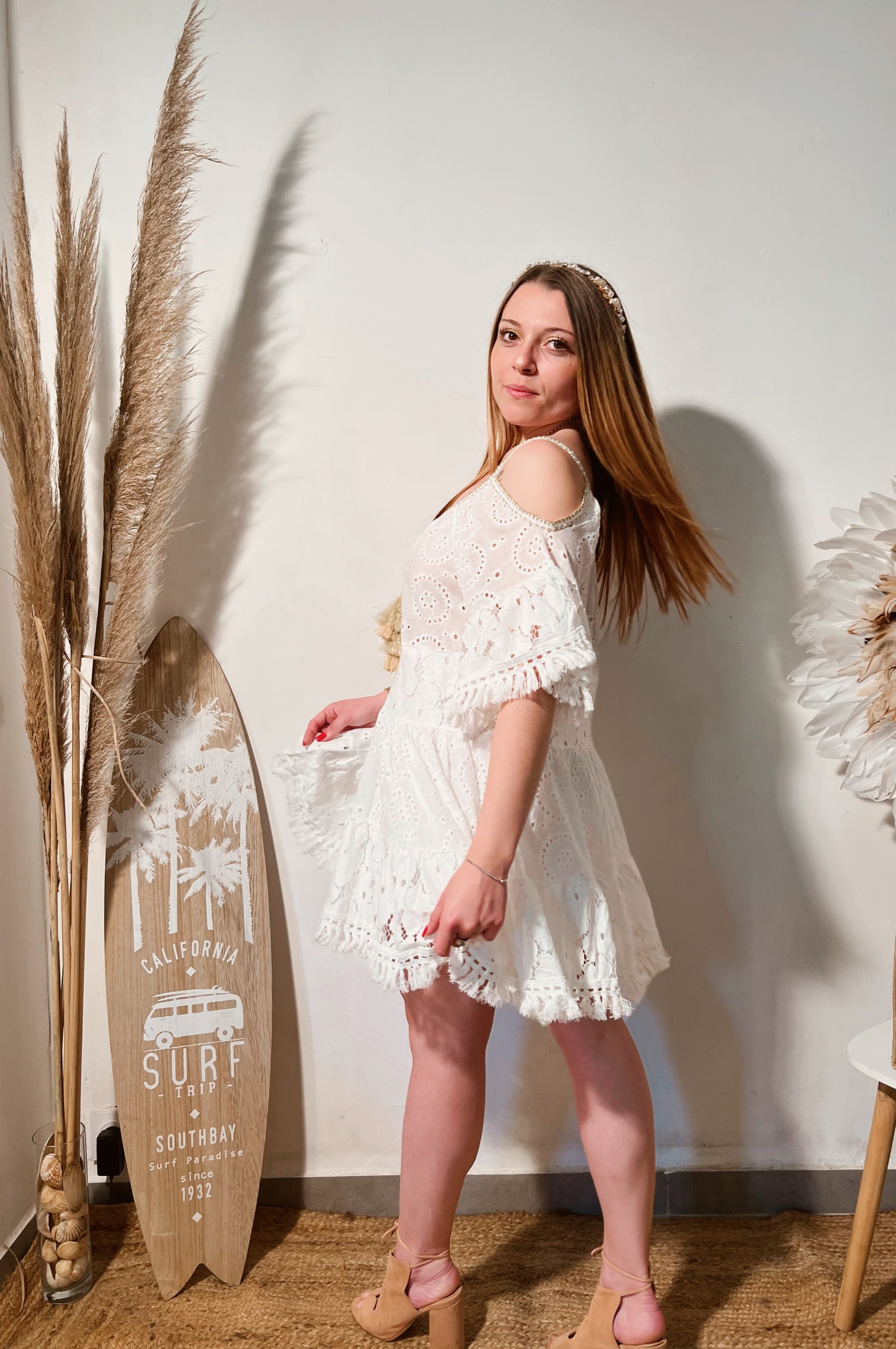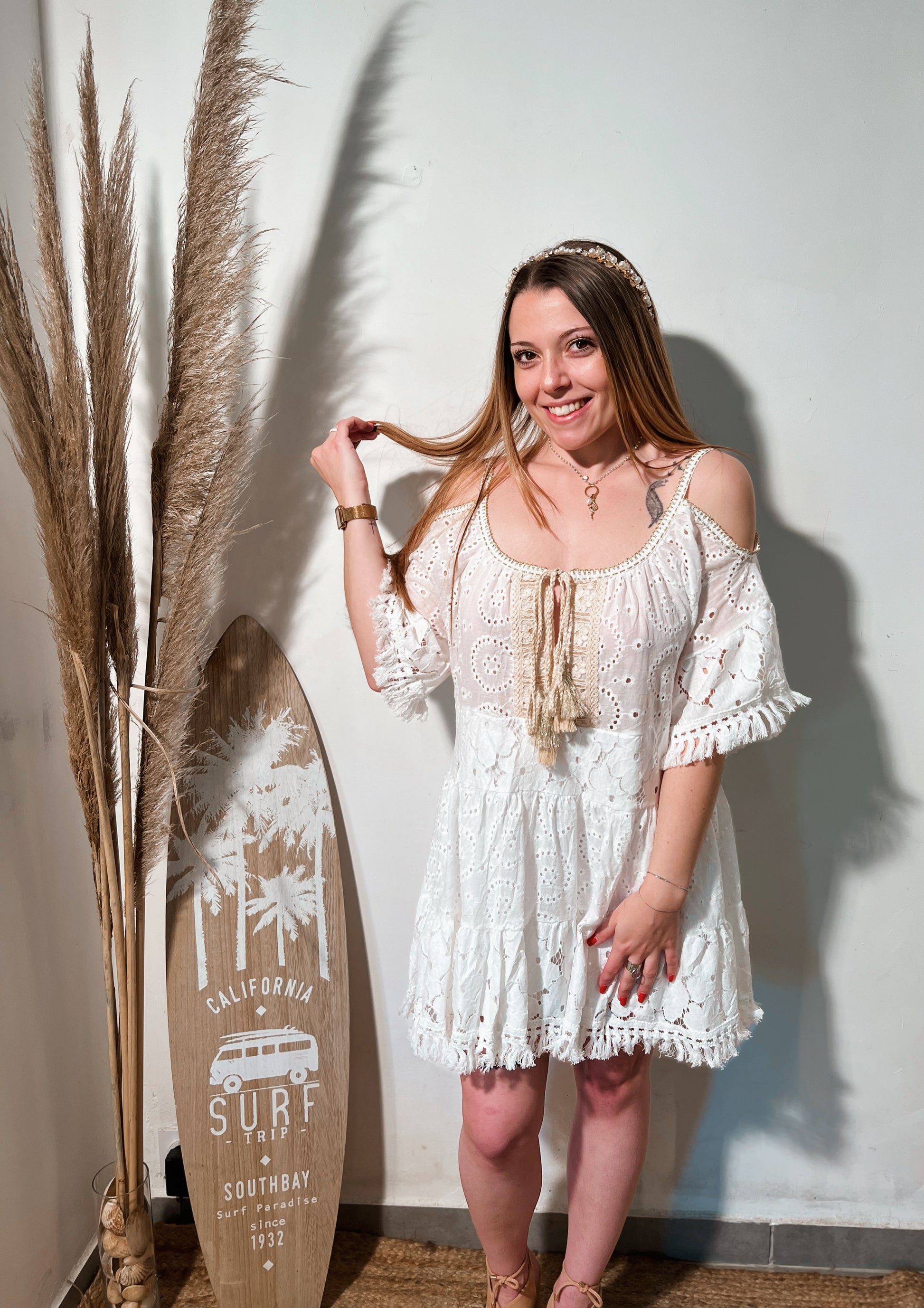 Robe épaules nues blanche à dentelle. Taille unique.