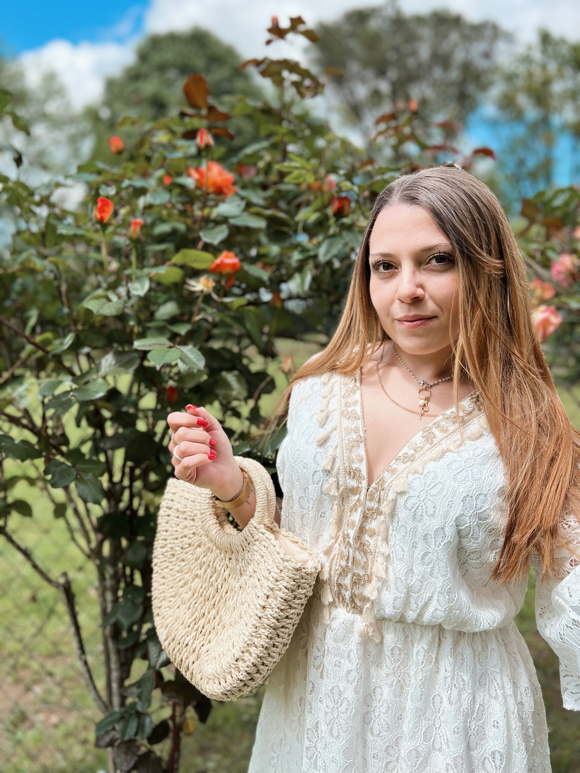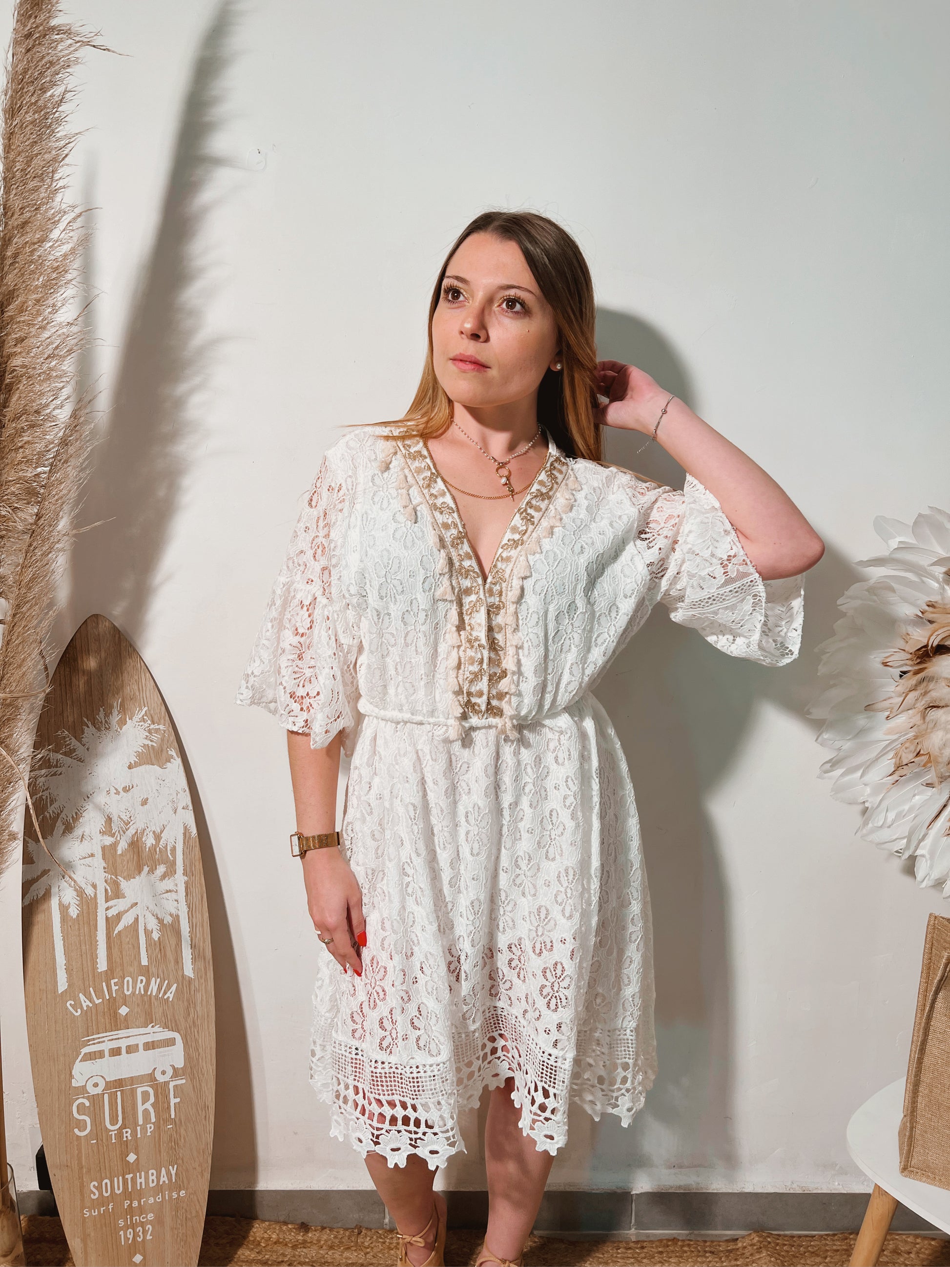 Robe en dentelle blanche avec des détails beige. Taille unique.