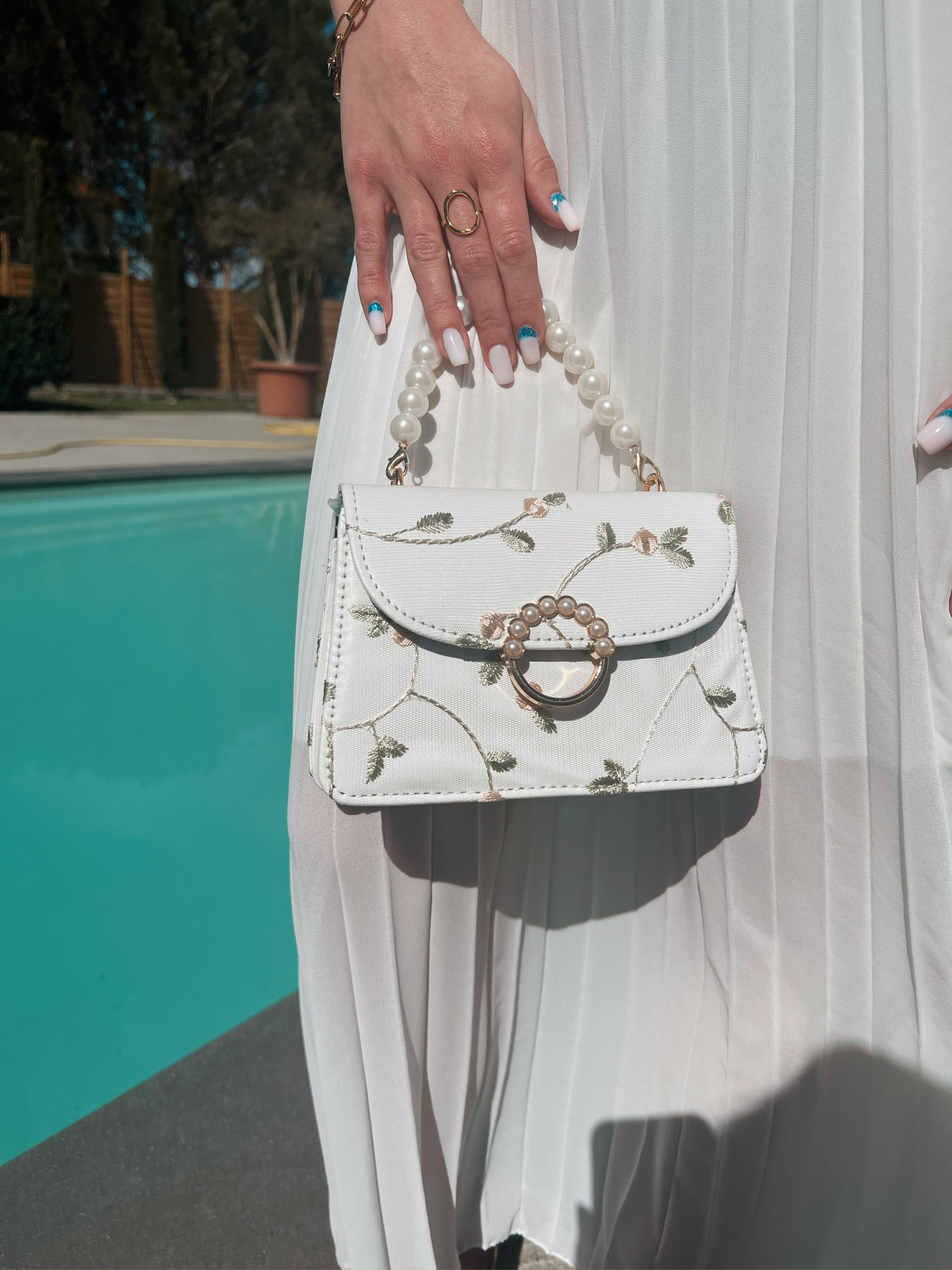 PETIT Sac à main blanc avec broderie verte et des perles.