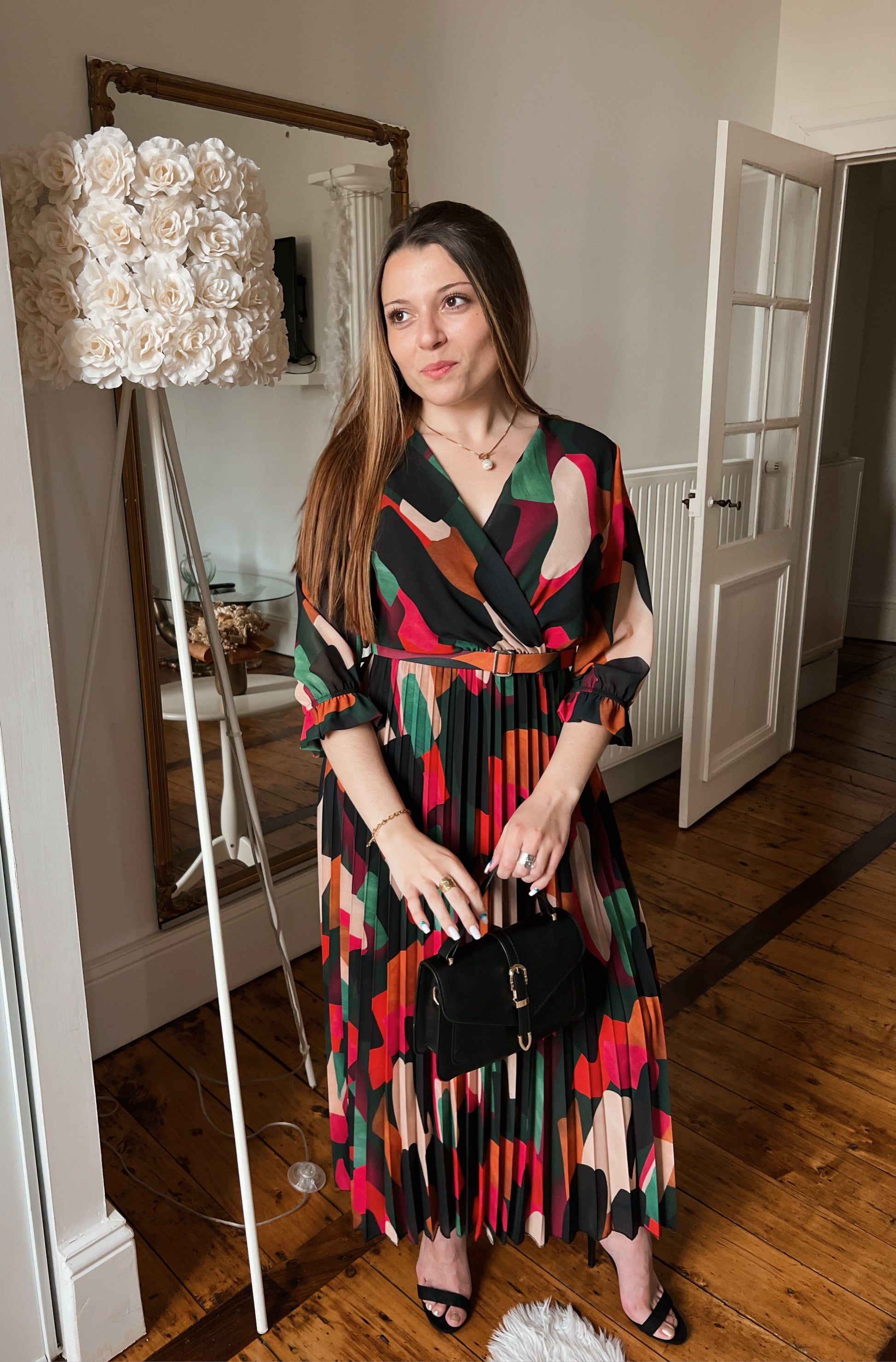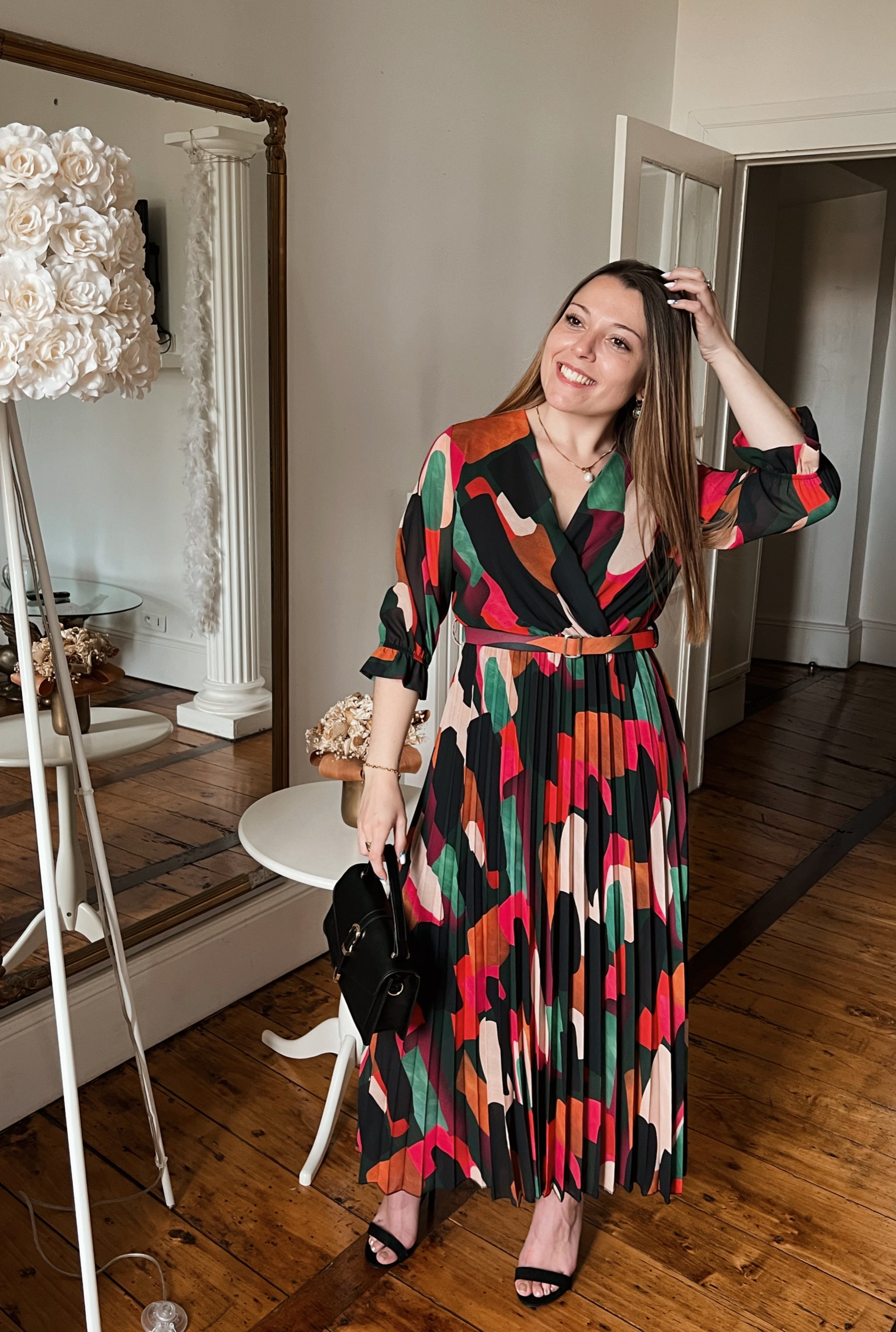 Robe plissée mi-longue colorée. Ceinture incluse. Manches 3/4 et petit décolleté.